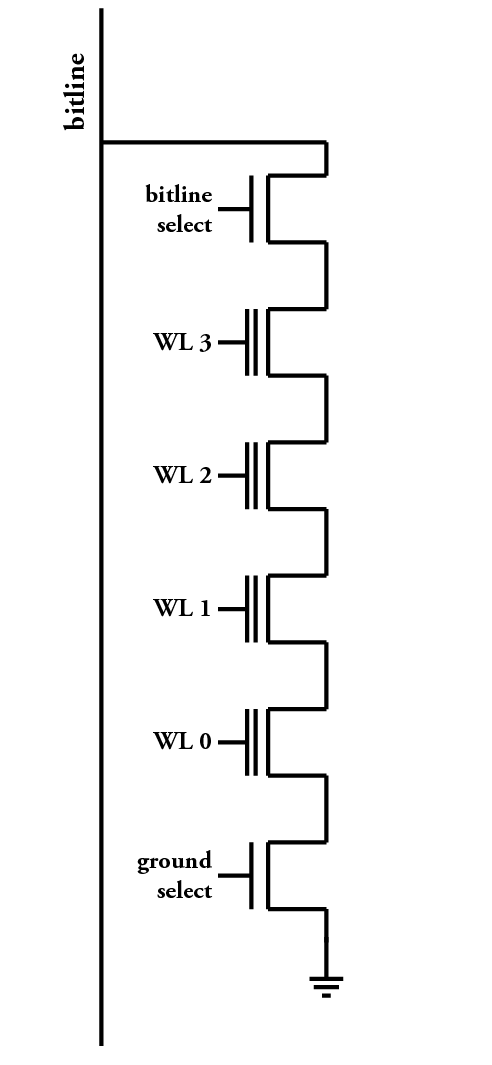 To understand how this can be, I've included an image to the right that shows a schematic of how the building blocks of NAND flash work internally (adapted from this drawing, from Wikipedia). This drawing shows one column of a NAND flash that has four pages; in total, four bits are represented here. To read from one page of flash, a charge is placed on the bitline, and then all of the wordlines (labeled 'WL') except for the one that we wish to sense are turned on. This means that charge can flow through the flash transistors that we're not trying to sense, and the one that we're trying to sense controls whether the charge stays on the bitline or whether it flows to ground. Then, some time later, we can sense whether that flash transistor was programmed or not by telling how much charge was left on the bit line. (This is a very simplified discussion, that may not make much sense without some background in the field. That's okay; this won't be on the final exam. The Wikipedia article on flash memory explains in some more detail, if you're interested.)