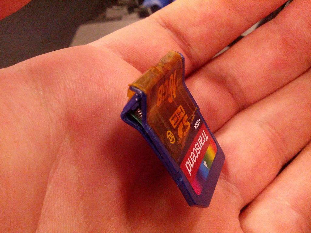Around June of 2012, I had gotten myself into a very bad habit. Instead of carrying my SD card in my camera, I left it sticking out of the side of my laptop, presumably intending to do something with the photos on it eventually. On my flight home from Boston, the predictable thing happened: as I got up out of my seat, the machine fell out of my lap, and as the machine hit the ground, the SD card hit first, and was destroyed.